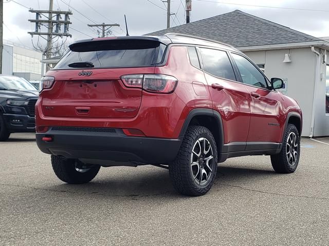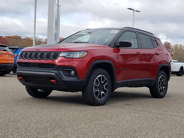 Red Hot Pearlcoat 2026 Jeep Compass Trailhawk 4WD 8-Speed Automatic 2.0L I4 DOHC 10.1" Touchscreen Display, 4-Wheel Disc Brakes, 4.398 Final Drive Ratio, 4G LTE Wi-Fi Hot Spot, 6 Speakers, ABS brakes, Air Conditioning, Alloy wheels, AM/FM radio: SiriusXM, Auto High-beam Headlights, Auto-dimming Rear-View mirror, Automatic temperature control, Brake assist, Bumpers: body-color, Compass, Delay-off headlights, Driver door bin, Driver vanity mirror, Dual front impact airbags, Dual front side impact airbags, Electronic Stability Control, Emergency communication system: SiriusXM Guardian, Four wheel independent suspension, Front anti-roll bar, Front Bucket Seats, Front Center Armrest w/Storage, Front dual zone A/C, Front fog lights, Front License Plate Bracket, Front reading lights, Fully automatic headlights, Global Telematics Box Module, Heated door mirrors, Heated front seats, Heated steering wheel, Illuminated entry, Knee airbag, Leather Shift Knob, Leather steering wheel, Low tire pressure warning, MyFlexCare Service Plan, Occupant sensing airbag, Outside temperature display, Overhead airbag, Overhead console, Panic alarm, ParkView Rear Back-Up Camera, Passenger door bin, Passenger vanity mirror, Power door mirrors, Power driver seat, Power Liftgate, Power steering, Power windows, Premium audio system: UConnect 5, Premium Cloth/Leather Trim Bucket Seats, Quick Order Package 29E, Radio: Uconnect 5 with 10.1" Display, Rain sensing wipers, Rear anti-roll bar, Rear seat center armrest, Rear window defroster, Rear window wiper, Remote keyless entry, Security system, SiriusXM Guardian - Included Trail (B), SiriusXM Radio Service, Speed control, Split folding rear seat, Spoiler, Steering wheel mounted audio controls, Tachometer, Telescoping steering wheel, Tilt steering wheel, Traction control, Trip computer, Turn signal indicator mirrors, Variably intermittent wipers, Wheels: 17" x 6.5" Painted Black Aluminum.